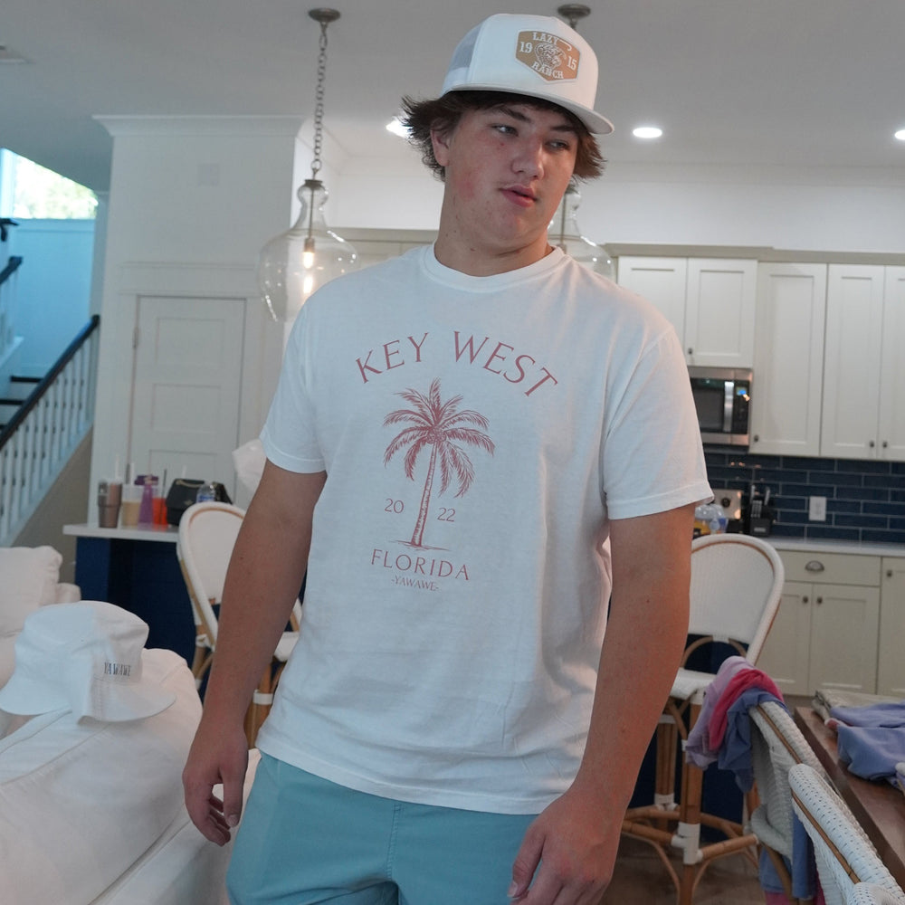 Features: Garment Dyed Tee Key West and Palm Tree Design screen printed across the front
